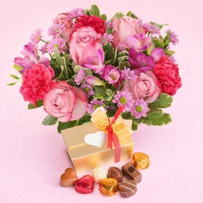 Laat uw hart spreken en stuur dit heerlijke boeket vol roze en kerskleurige bloemen naar een liefde. Het doosje Belgische pralines (125gr) voegt extra waardering toe.